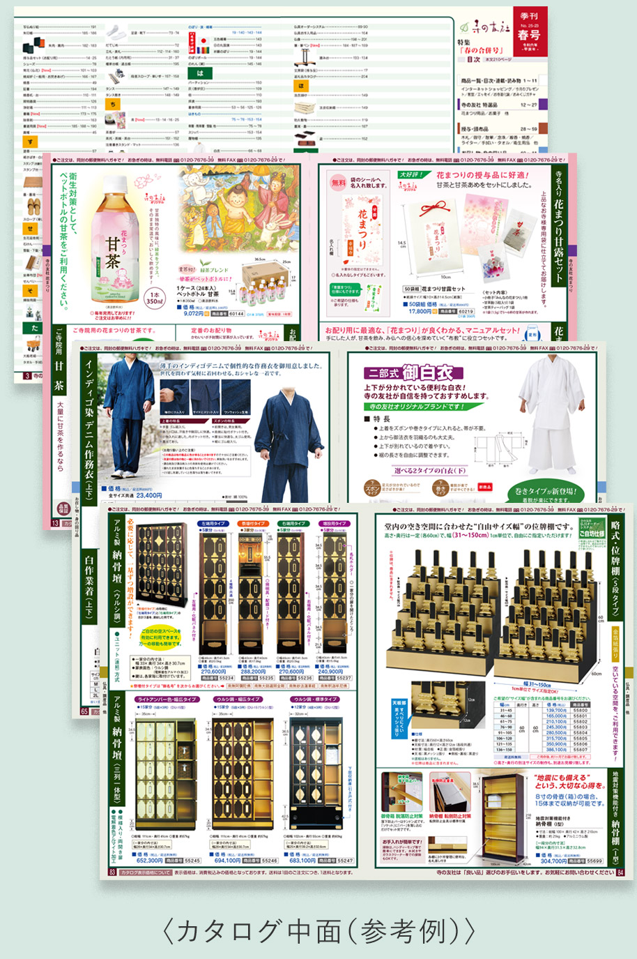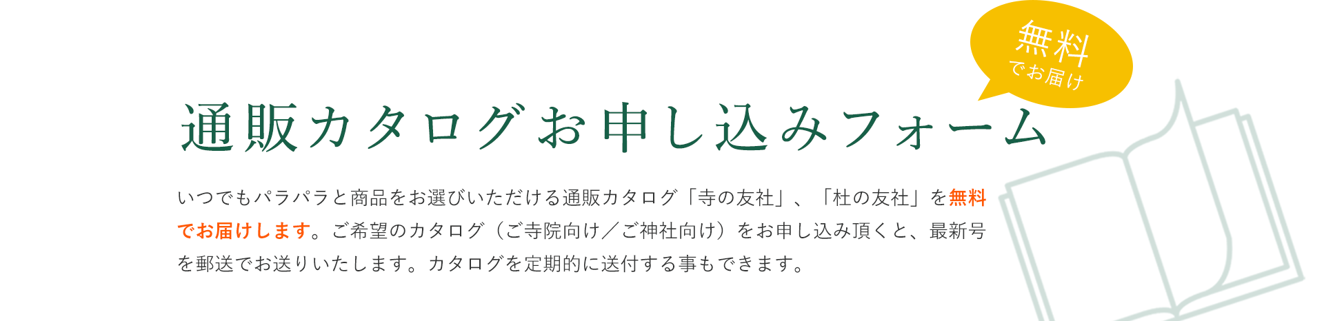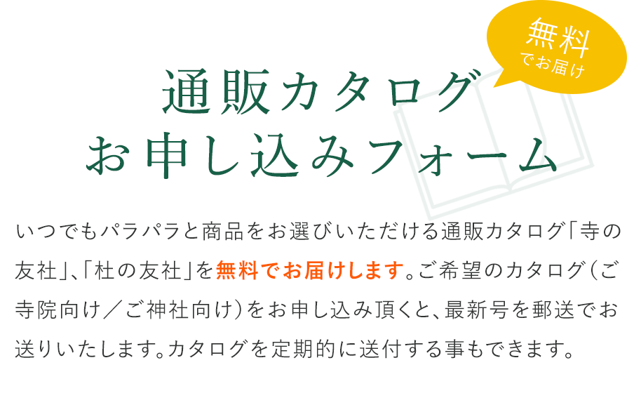 下記のプルダウンより「寺の友社」カタログか「杜の友社」カタログ商品をお選びいただき、冊数を1、ご希望の回数にチェックを入れていただき、そのまま購入フォームにお進みください(費用は発生いたしません)。無料でお届けいたしますので、ご購入完了でカタログ申し込みを承ります。