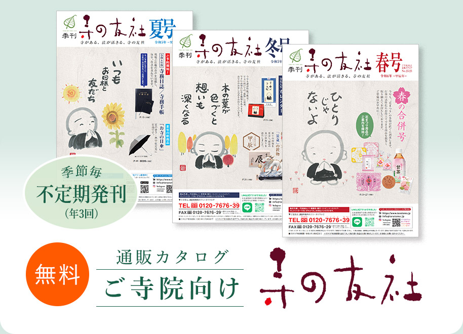 ご寺院及び、寺を持たない僧侶様へ、ご活躍を支援する用品・身の回り品をご案内しています。寺院運営用品、境内管理用具及び、身の回り品を中心に、お役立ち商品を多数取り揃えております。
